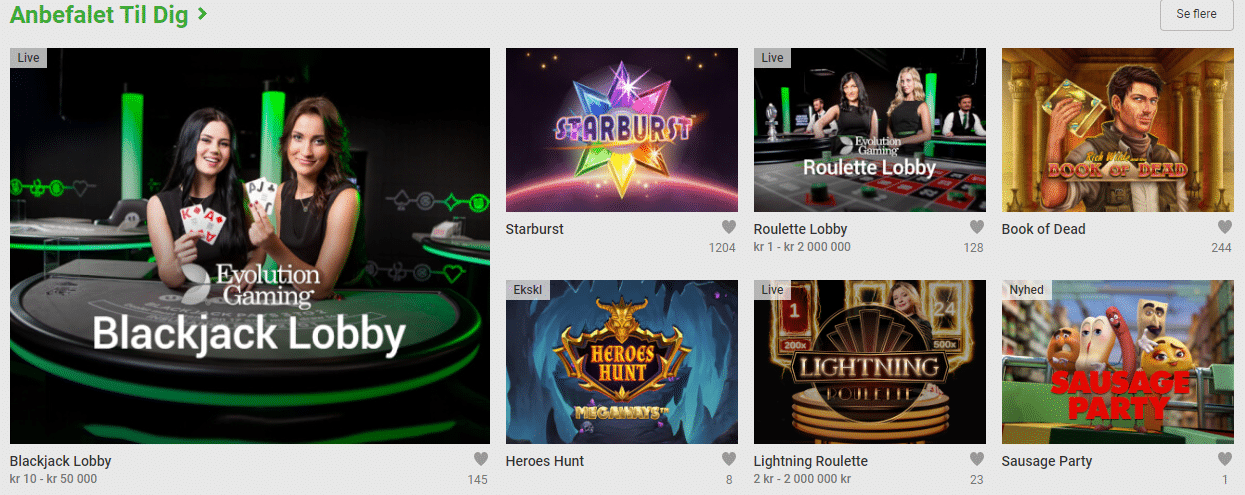 Casino: 100 % matching på 500 kroner som første indbetaling. Kravet til denne bonus er, at der bliver indbetalt præcist 500 kroner som første indbetaling. Bonussen skal nu omsættes 10 gange inden for 60 dage for at undgå, at bonussen og eventuelle gevinster frafalder igen. Det er et krav, at bonussen skal gennemspilles på en af følgende slotmaskiner: Starburst, Bonanza, Book of Dead, Gonzo’s Quest, Danish Flip, Jolly Dicers, Troll Hunters 2, Ice Wolf, Jammin Jars, Voodoo Gold, Big Win 777, Fire Joker, Reactoonz, Divine Fortune og Jingle Spins.