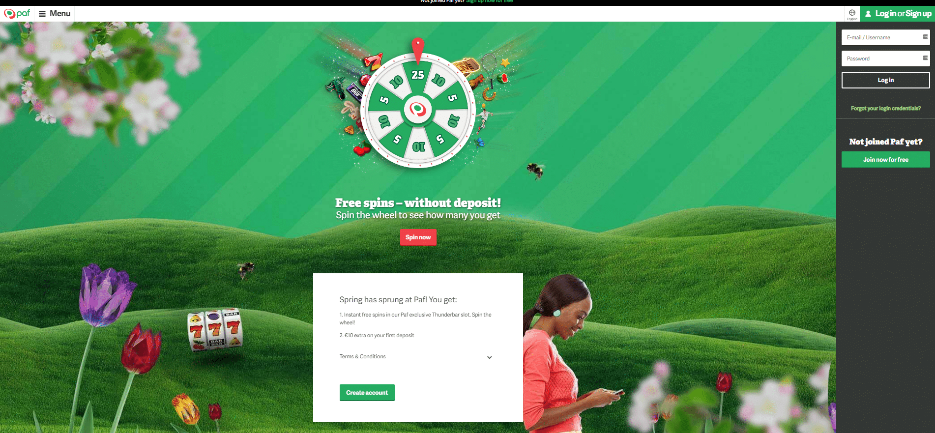 Paf palkitsee uudet pelaajansa ensitalletusbonuksella, joka on 10 euroa ja 25 Ilmaiskierrosta Thunderbar-peliin. Bonukset maksetaan pelaajan pelitilille muutaman minuutin sisällä talletuksesta. Ilmaiskierrokset tulee käyttää 7 päivän sisällä niiden lunastamisesta. Bonukseen ei liity kierrätysvaatimusta.