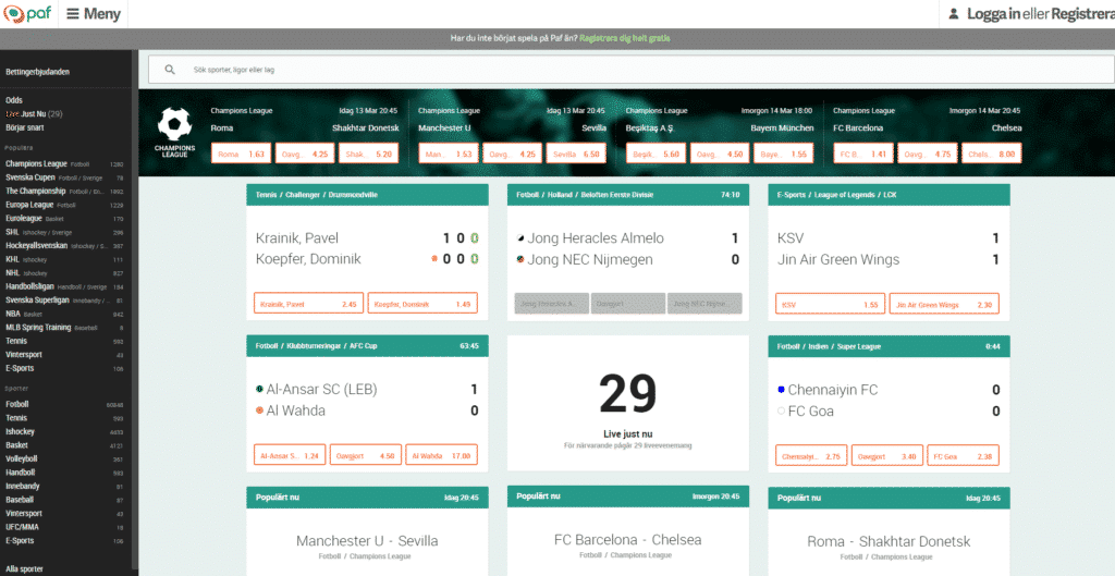 Paf Betting erbjuder spel på 30 olika sporter och evenemang, där det inte är ovanligt att det finns flera tusen olika spel att spela inom varje sport. Det kan t.ex. handla om att spela på vem eller vilka som ska vinna ett särskilt evenemang, eller bara vissa delmoment.