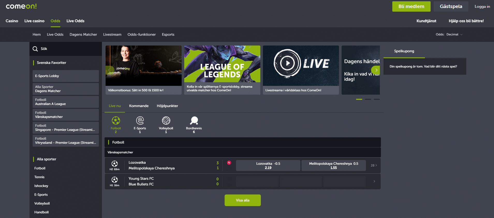 - Spela på odds, live odds, casino och live casino
