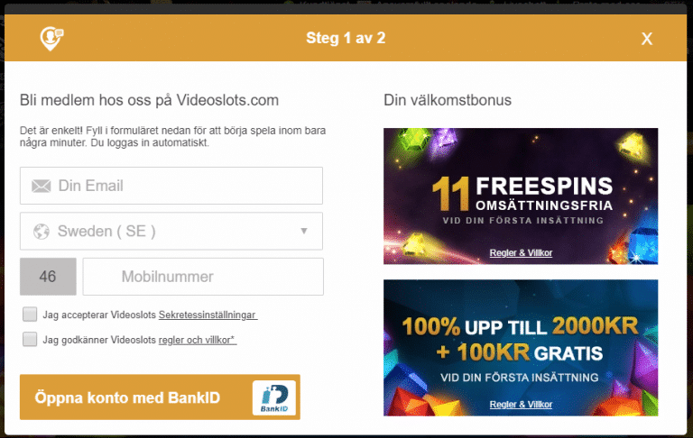 Det första man möts av när man går in på Videoslots hemsida är deras registreringsformulär. Här fyller man i sin mejladress, vilket land man spelar ifrån, samt mobilnummer, sedan signerar man med e-legitimation. Registreringen tar bara några minuter, samt är väldigt enkel och smidigt tack vare registreringen med e-legitimation.